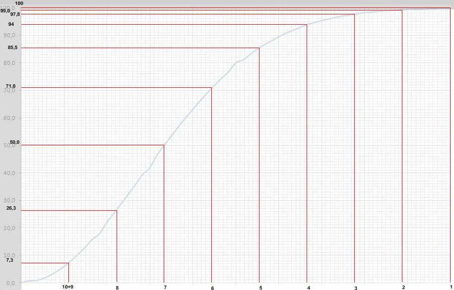Для этого по Таблице 2 строим на миллиметровке график (серая кривая на диаграмме ниже). Затем делим горизонтальную ось на количество габаритов мишени, т.е. на 9 равных отрезков. Если длину горизонтальной оси принять за 1, то длина каждого отрезка составит 1 : 9 = 0,1111.