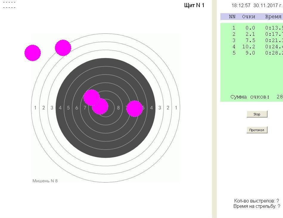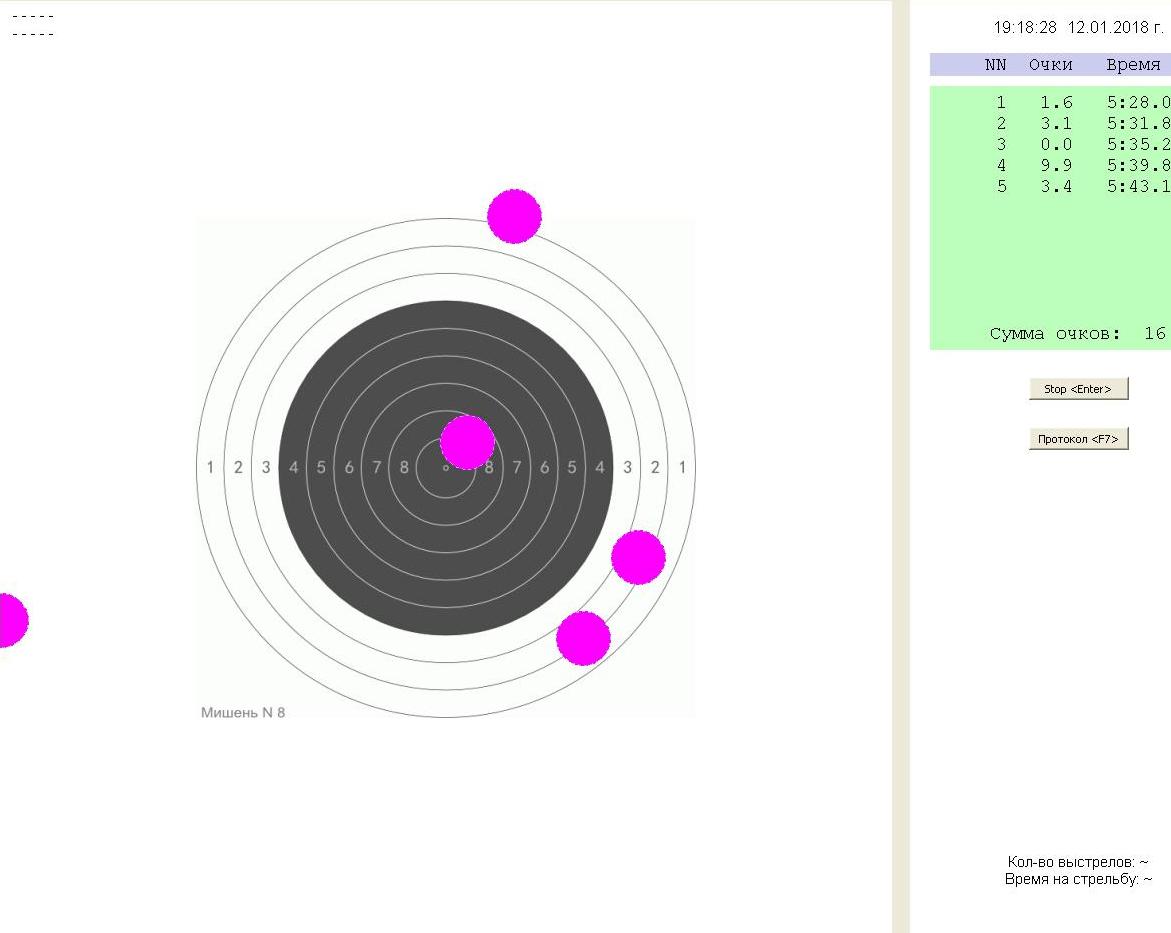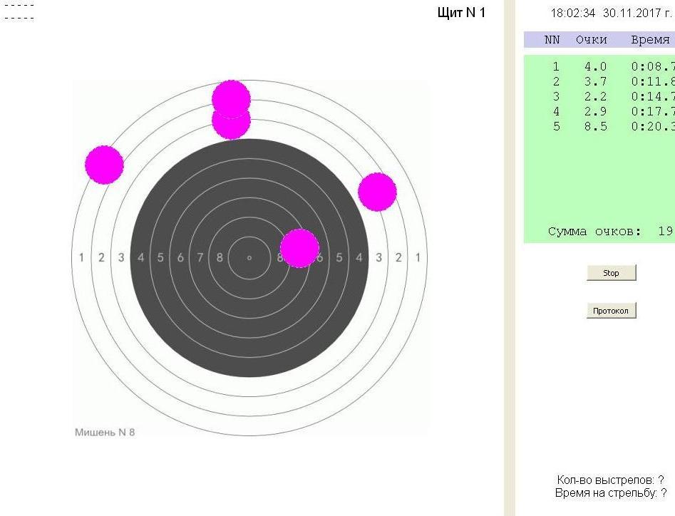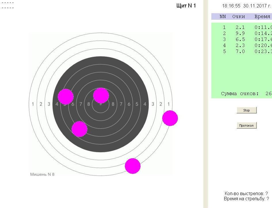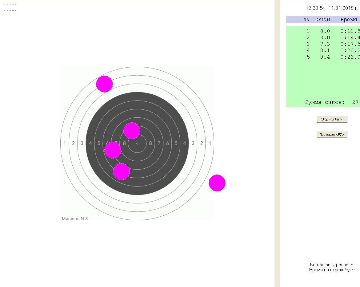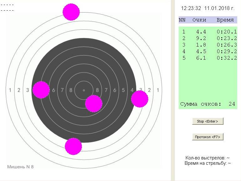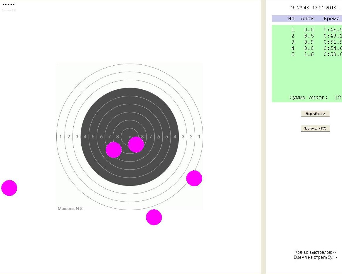 Выводы. Было произведено 26 серий по 5 выстрелов. Несмотря на то, что количество фактически выбитых очков несколько отличалось от теоретически расчитанных, сделанная по количеству попаданий внутрь габарита 5 (что соответствует попаданию в круг диаметром 25,5мм) оценка "незачет", "бронза", "серебро" или "золото" оказалась верной в 25 случаях из 26. В двух случаях оценки по количеству попаданий в круг диаметром 25,5мм оказались заниженными: Серия № 14 - при двух попаданиях, количество фактически выбитых очков 28 и оценка "серебро" оказались выше ожидаемой в случае двух попаданий оценки "бронза".